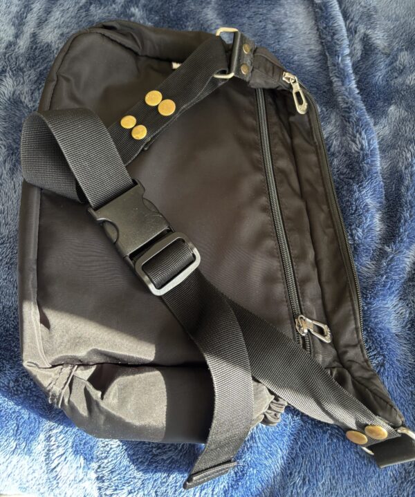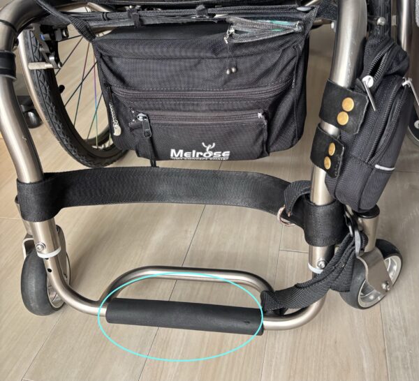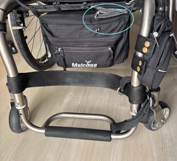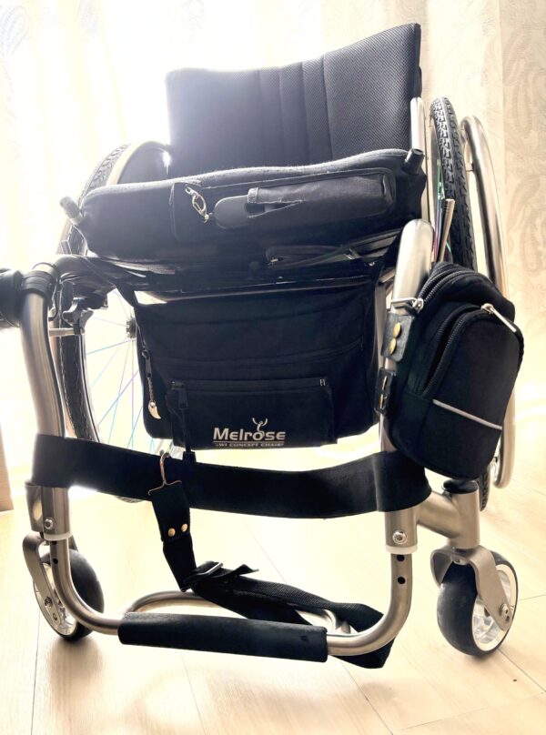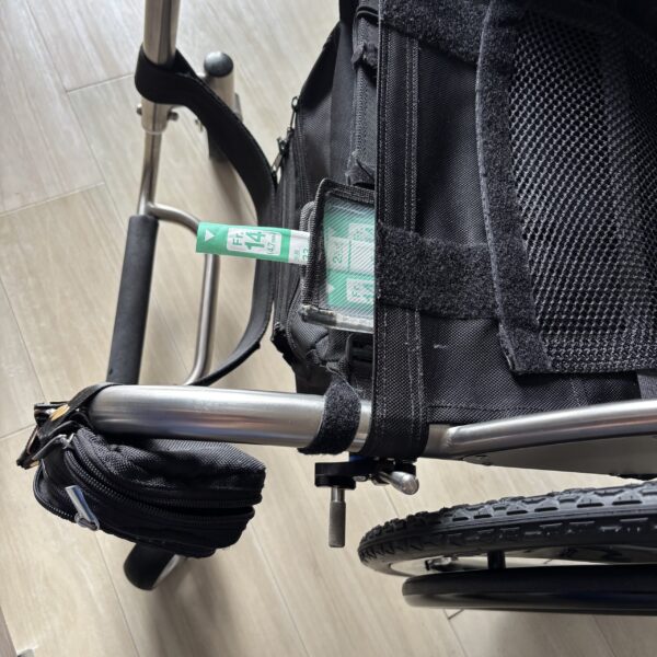 ・車椅子背面バッグ加工 車椅子の背面サポートにあわせて取付られるように 好みのバッグのベルトを 切った貼ったして加工 外出先で荷物が少々できてもこれであんしんです 好きなバッグを少し調整してみてはいかがでしょうか