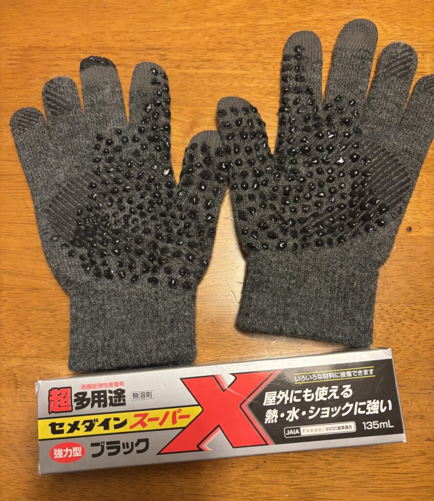 ・ニットの手袋が好きですが すべってしまいリム操作できません そこでオリジナル滑り止め 爪楊枝で布にボンドを押し付けちょんちょんと つけていきます 施工直後はテカテカで悪目立ちですが しばらく使えばツヤもなくなりはじめから滑り止めがあったかのように なじんできます 後から塗り重ねるとはがれちゃいます 実証済 一発勝負で願います
