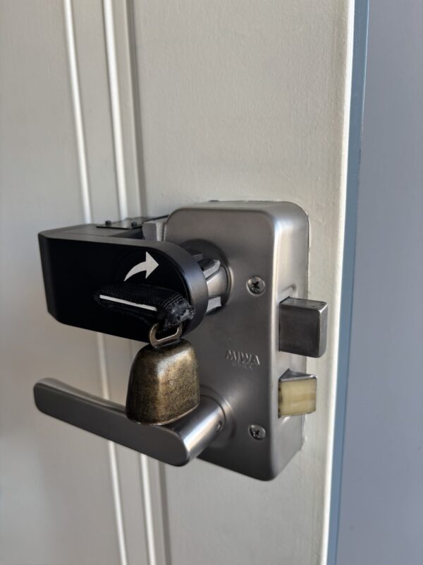 ・ただこの製品 静かが売りなのですが わたしの環境では動作確認をしたい + 外側にも解除の合図をしたいので レバーが動くたび鳴るように鈴を後付けした