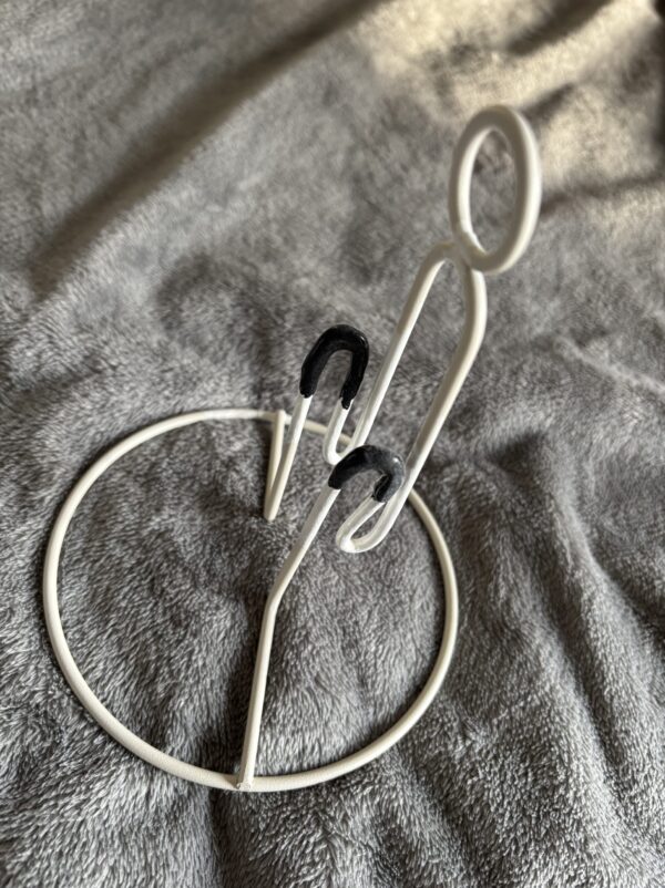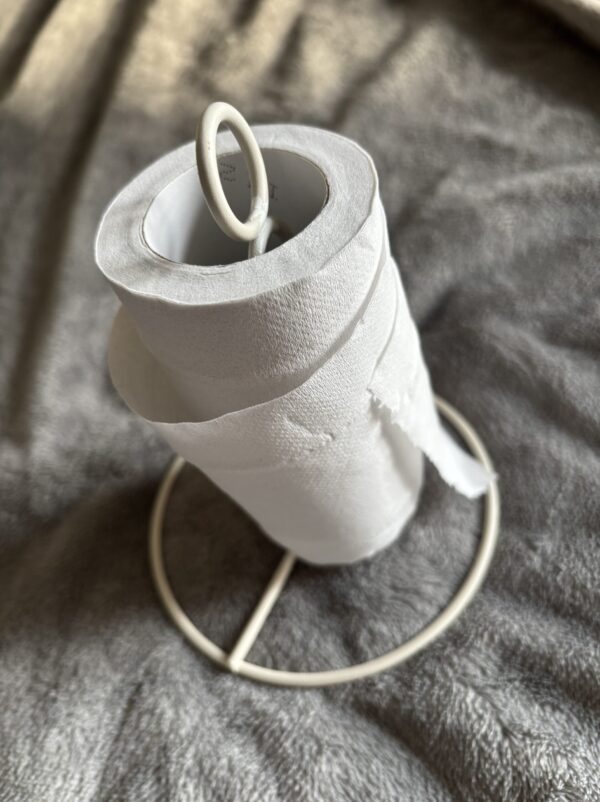 ・トイレットペーパーホルダー加工 訪看さんが使うトイレットペーパー コロコロ転がって使いにくそうだったので キッチンのペーパーホルダーの鉄線タイプをひんまげて縮小トイレットペーパーサイズにしました 得意のゴムボンドで芯の滑止めももちろんです