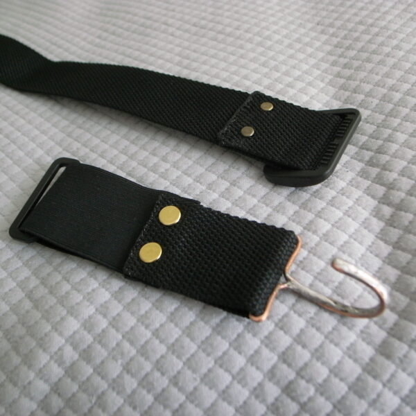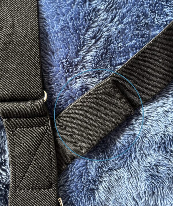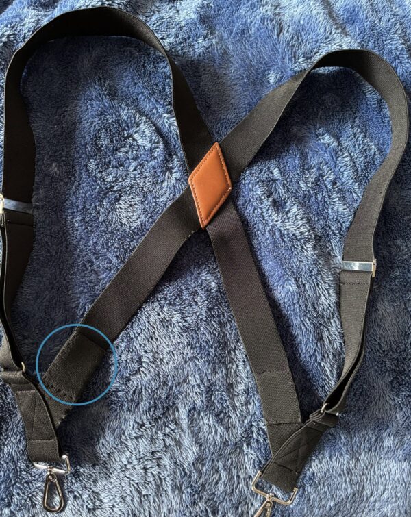 ・サスペンダー長さ詰め加工 どういう測定をして製品化したのか理解にくるしむ 装着した時に菱形の革部分が“首までくる長さ”だったため 縫い詰めての加工例です