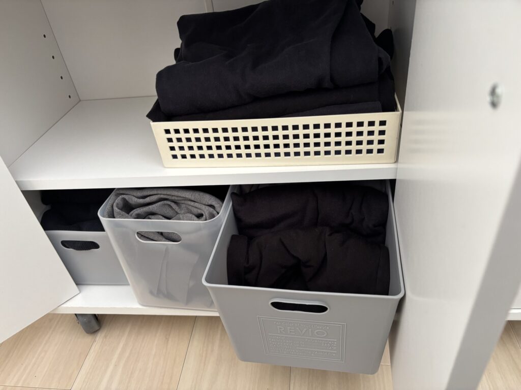 追加しました 車椅子で衣類をキャビネット下部に下を向いて収納するには ちょっとめんどうです かがんで出し入れするたいへんさを感じます 衣類を入れた このケースごと出し入れすれば 少しはラクになります サイズを測り100円ショップへGO