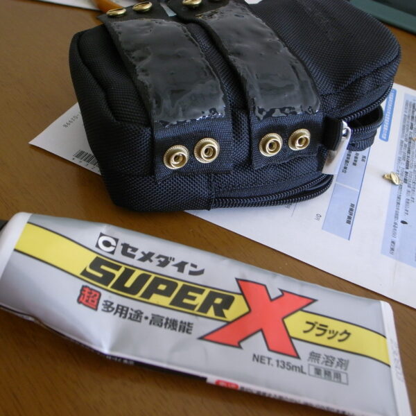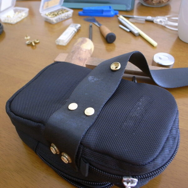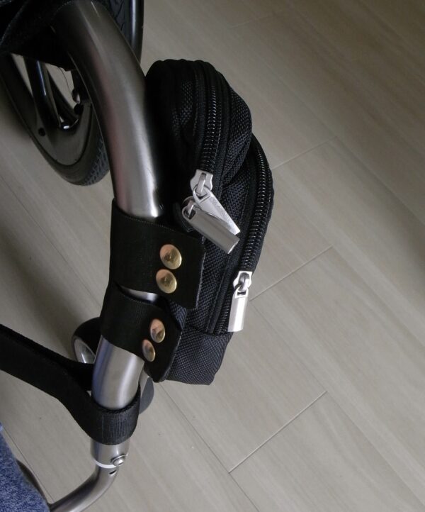 ・車椅子前面パイプポーチ加工 裏側に幅広ベルトを縫いつけ リベット留めして ゴムボンドを滑り止めに塗り付け(あっしっかりと乾いてからの取付ですよ)ジャンパーホックで 付け外しできるようにしてみました iPhonや眼鏡こまごましたものが入れられます ホームセンターの「ガテン系コーナー」にあるポーチ流用