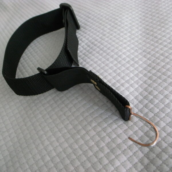 ・フットベルト作成 ずり落ち防止用 どうしても足がフットパイプからずれ落ちてしまうので 銅線ひんまげてハンダ付け補強し引っ掛け部分を作り ナイロンベルトをサイズ調整可能なようにしてつくってみました 外出時は必需品です