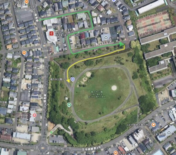 一方通行が多い住宅街を通ります みどり線が公園入口までの進入路 こちら側に駐車場はありません きいろ線がスロープです 車椅子で園内にはいるにはこのスロープを行くしかありません。
